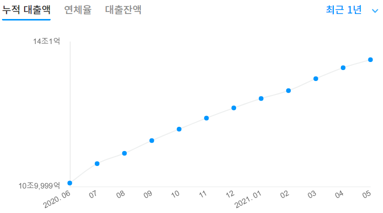<P2P 업체 대출잔액(위) 및 연체율(아래) 추이 (2021년 5월 말)>