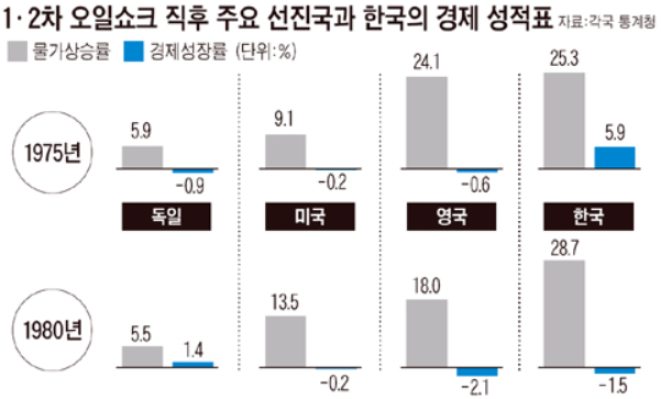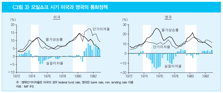 미국과 영국은 1973년 1차 오일쇼크 이전부터 재할인율과 단기이자율을 단계적으로 인상시키며 긴축 기조를 유지하였으나, 유가 충격이 닥치자 경기침체를 우려하여 일관성 없이 단기이자율을 낮추는 확장정책을 시행하였다. 이에 따라 두 국가 모두 두 자릿수의 고인플레이션을 경험 하였는데, 미국은 충격 후 2년, 영국은 4년이 지나서야 위기 이전의 수준으로 진정시킬 수 있었다. 2차 오일쇼크 시기에도 두 나라는 초기에 긴축정책을 펼쳤으나, 과거에서 교훈을 얻지 못하고 경기침체를 우려하여 80년 이 후 확장정책으로 전환했다. 그리고 잘못된 정책으로 인해 고인플레이션이 지속되자 또다시 고강도 긴축정책을 수행해야만 했고, 결국 82년이 되어서야 인플레이션을 진정시킬 수 있었다.