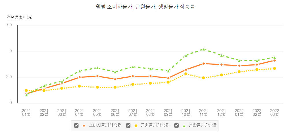 게다가 한국의 소비자물가지수는 집값을 반영하지 않아서 과소계상되어 있는 상태. 실제 미국의 책정방식과 같이 3월 물가(4.1%)에 자가주거비 즉 집값을 반영한다면 실제 물가는 5.6%에서 6%를 웃돌 것으로 보고 있다.