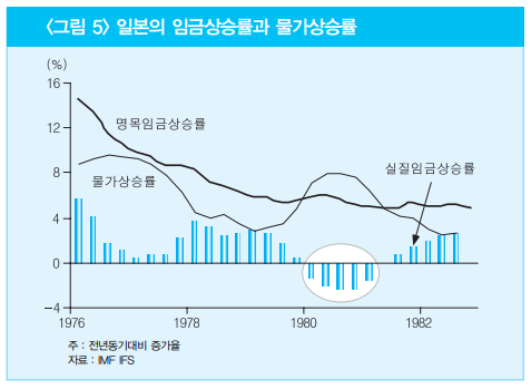 1차 위기 당시 일본은 독일처럼 긴축 통화정책을 유지 했음에도 높은 물가상승률을 기록했다. 이는 비록 긴축 기조를 유지하였지만, 인플레이션을 통제할 정도로 강한 정책이 되지 못하여 고인플레이션을 막지 못했던 것이다. 효율적인 통화정책을 사용하는지 판단하는 기준은 사후적 실질이자율(= 명목이자율 - 물가상승률)을 통해 살펴 볼 수 있는데, 높은 인플레이션 하에서 실질이자율을 + 값으로 유지 한다는 것은 강력한 긴축정책을 수행 하였음을 나타낸다. 하지만 일본은 1차 위기 시 충분하지 못한 긴축정책으로 실질이자율을 양의 값으로 전환시키지 못했다. 이에 반해 독일은 1, 2차 위기에 모두 실질 이자율을 양의 값으로 유지했다. 1차 위기에 실책에서 교훈을 얻은 일본 중앙은행은 2차 오일쇼크 시기에는 물가상승률보다 단기 이자율을 높게 유지하여 물가 상승을 억제할 수 있었다.