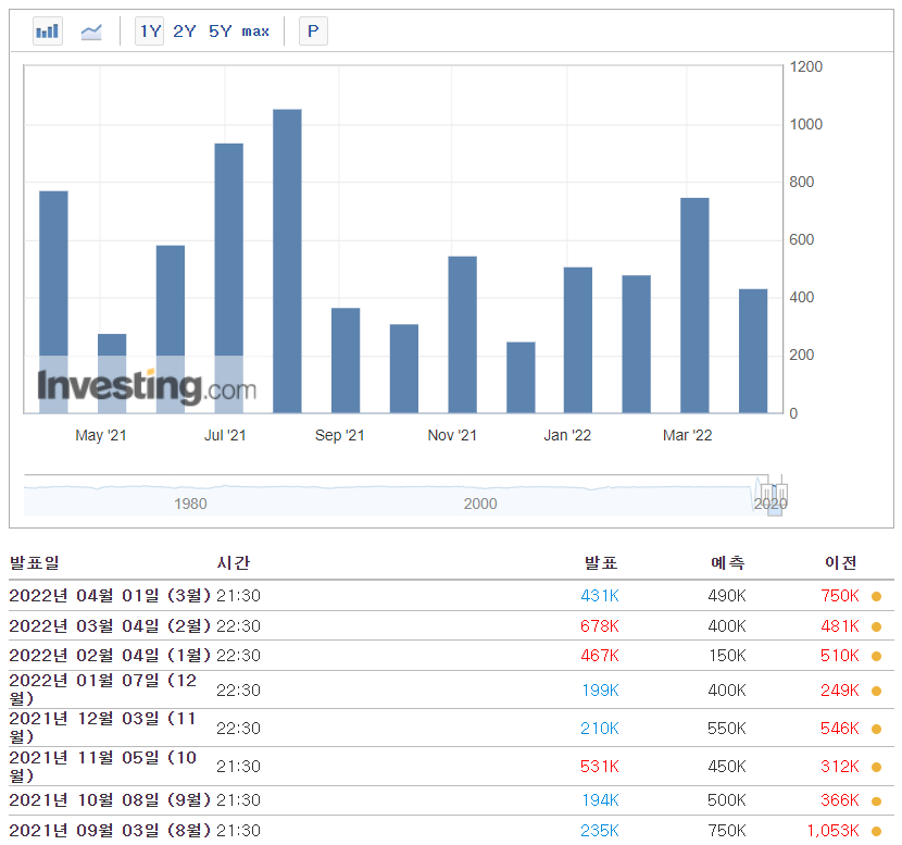 한국과 미국 모두 물가와 긴축은 논란의 여지가 없는 상수로 자리잡았고, 2022년 3월 미국의 비농업고용지수는 전망치를 하회한 431,000명 선에 그쳤다.