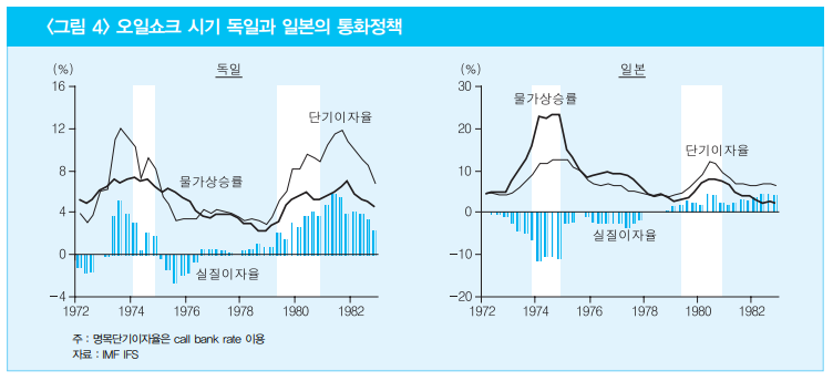 반면 독일과 일본은 오일쇼크 후에도 긴축 기조를 일관되게 유지했던 국가이다. 1차 위기 이전부터 긴축정책을 수행하 였던 두 나라는 유가 충격이 발생하자 재할인율을 높은 수준에서 계속 유지하는 긴축정책을 펼쳤다. 독일의 경우 1, 2차 오일쇼크 기간 모두 인플레이션을 상대적으로 낮게 통제할 수 있었다. 일본의 경우 1차 위기 중에는 긴축정책 에도 불구하고 두 자릿수의 고인플레이션을 경험했지만, 2차 위기 시에는 물가상승률을 한 자릿수로 유지할 수 있었다.