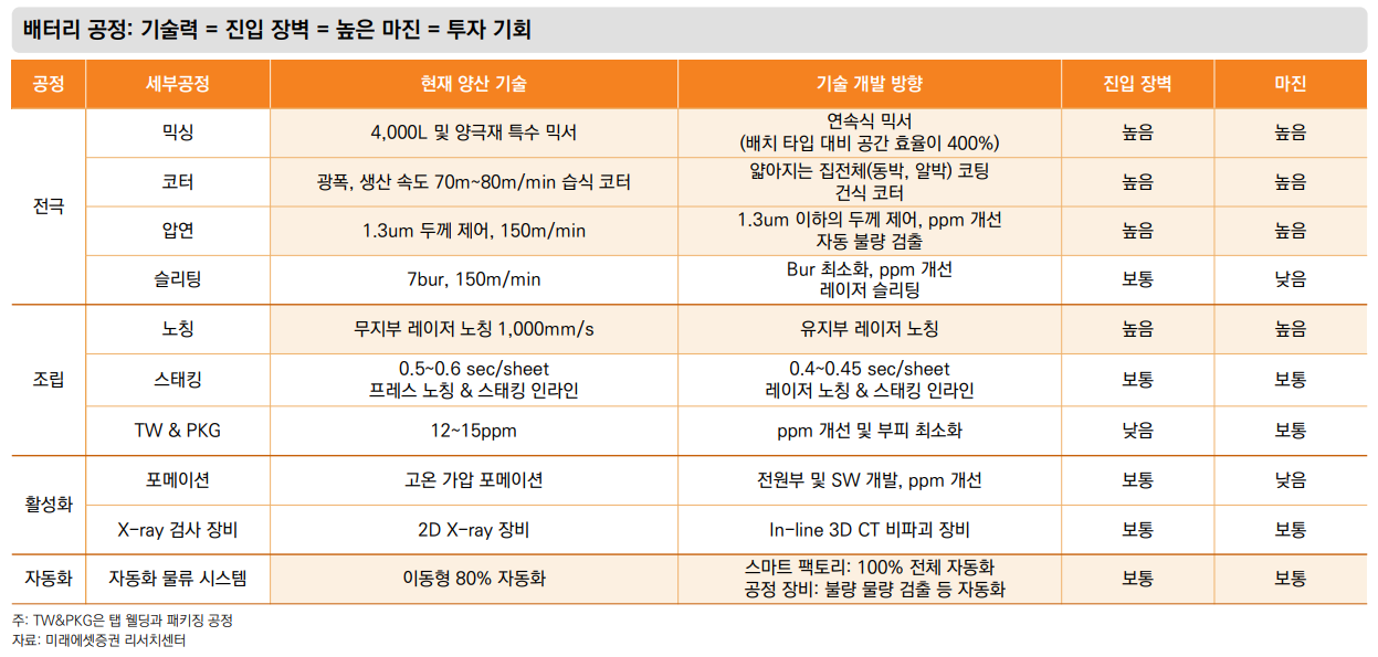 현재 2차전지 장비업계에서 가장 부각되는 공정은 자동화 공정이며 조립공정에서는 디이엔티의 양극 레이저 노칭을 시작으로 기존 프레스 노칭을 레이저 노칭으로 대체 중. 전극 공정 중 연속식 믹서, 건식 코터 등도 테스트 단계.