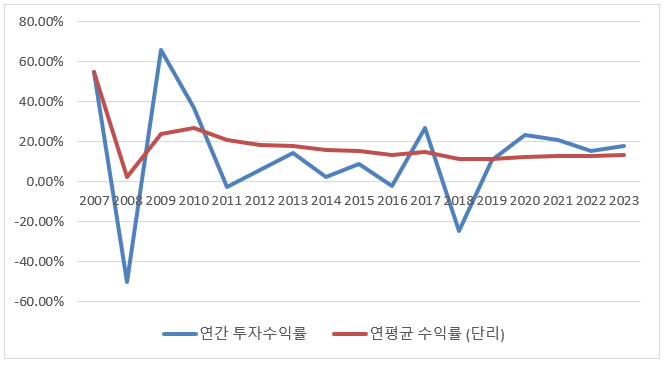 <2007년부터 현재까지 연간 수익률 및 연평균 수익률 추이>