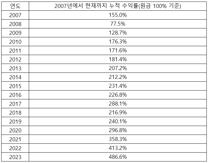 <2007년에서 현재까지 누적 수익률(원금 100% 기준)>