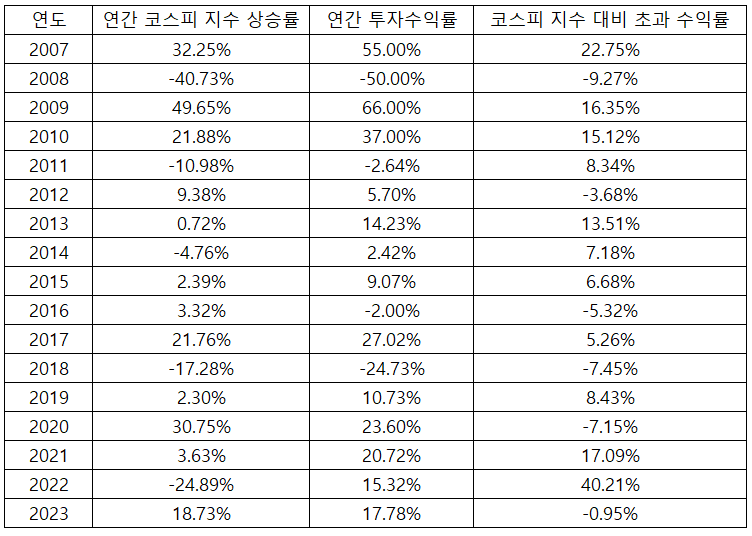 <2007-2022년 연간 투자수익률 결산 내역>
