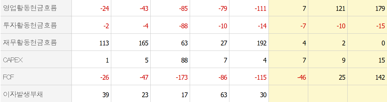 -재무활동 현금흐름의 +이지만 턴어라운드 이 후 급감할 전망이고, 자금조달에 지속적으로 의존하고 있으며, CAPEX 비용 역시 2022년 피크 이 후 하향안정. 턴어라운드가 컨센서스대로 진행되는지 정도가 리스크로 보임.