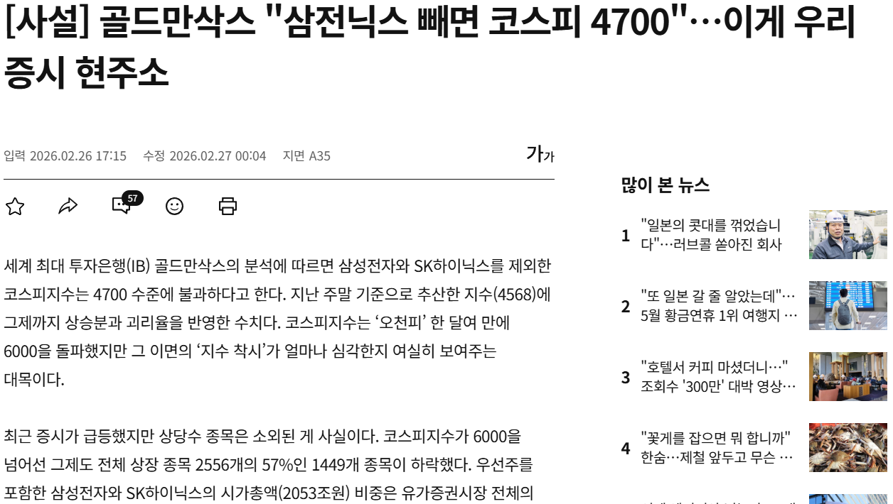 [사설] 골드만삭스 "삼전닉스 빼면 코스피 4700" … 이게 우리 증시 현주소, 오피니언