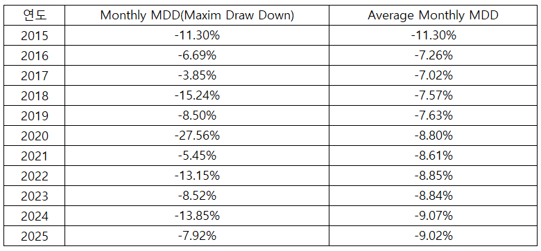 코스피 월간 MDD를 기록한 2025년 4월은 계엄사태로 인한 사회와 시장의 혼란이 극에 달한 시기였고, 동시에 계좌에 일간 MDD를 기록한 시기이기도 했다. 하지만 그런 사회 혼란 속에서도 코스피 월간 MDD가 개선됨에 따라 계좌의 일간 MDD 역시 개선되었다는 점은 그동안에 리스크관리가 일단위에서는 어느 정도 워킹한 거 아닌가 싶다.