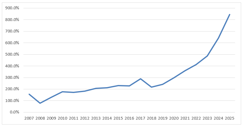 <2007년에서 현재까지 누적 수익률(원금 100% 기준)>